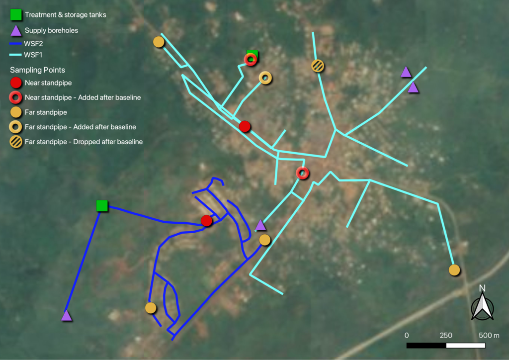 Figure 1. Map of the two water supply facilities participating in this study and their respective sampling points.