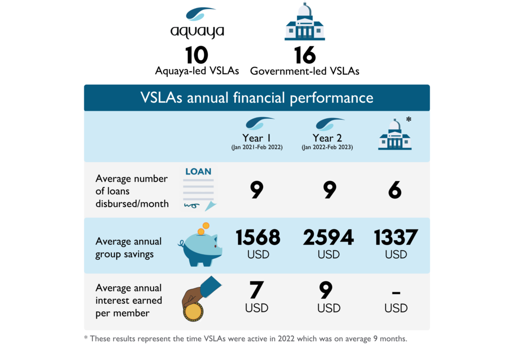 For the government-led VSLAs, less external support from Aquaya in the first year likely contributed to lower performance, though these VSLAs led to improvements over the status–quo of no water payments. Despite the lower performance, implementing the VSLA–based “water fund” approach via government staff may allow for cost-sharing between external NGOs and local government while bolstering interest and capacity among local actors to provide ongoing support.