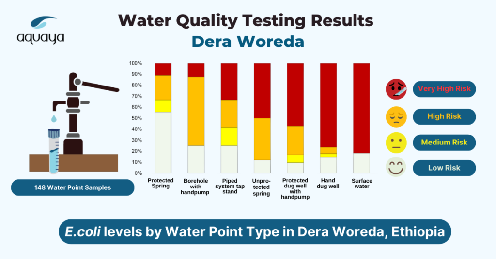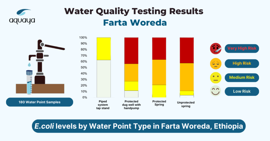 We conducted surveys and tested E. coli at 180 water points, including improved and unimproved types. Only 10% of water points were free from E. coli contamination. Water was microbially safest from piped system tap stands (63% free from E. coli) and less safe from dug wells with handpumps, springs, and surface water (8% free from E. coli). Watertracs