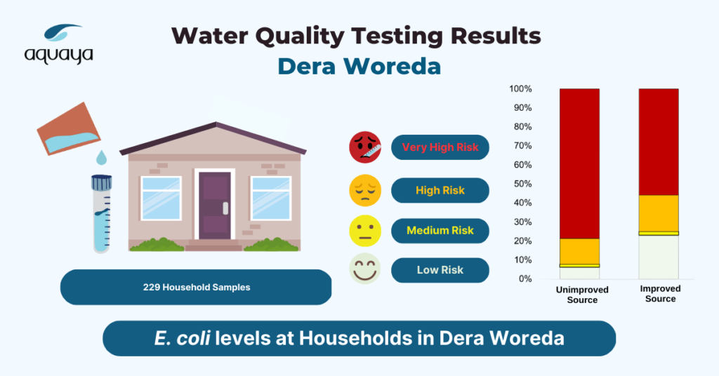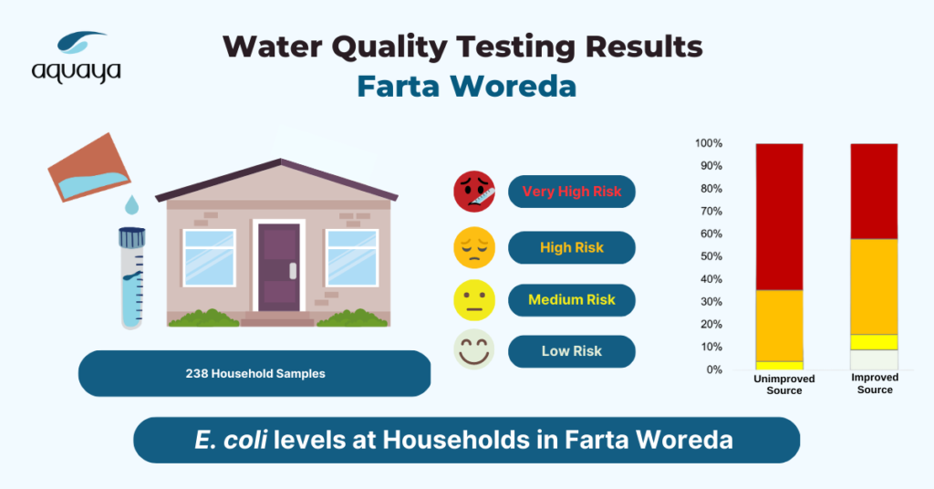 We detected E. coli in 96% of stored household water samples, and over half were in the very high-risk category. Household samples from an improved source like a tap stand had safer water (9% free from E. coli) than those collected from unimproved sources (0% free from E. coli); however, most households had water from an unimproved source.