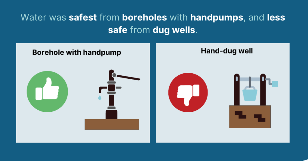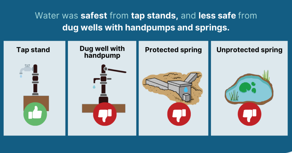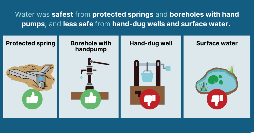 We conducted surveys and tested E. coli at 158 water points, including improved and unimproved types. Only 16% of water points were free from E. coli contamination. Water was microbially safest from protected springs and boreholes with hand pumps (41% free from E. coli) and least safe from dug wells and surface water (16% free from E. coli).