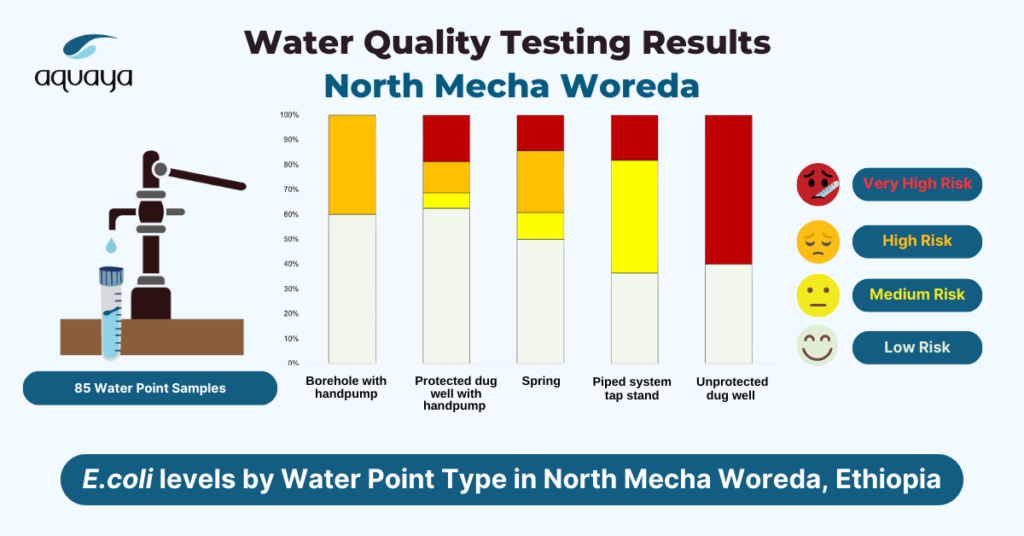 With funding from the Conrad N. Hilton Foundation, partnering with Bahir Dar University in Ethiopia, Aquaya has been participating in a student fellowship program and collecting water quality monitoring data in selected districts in Ethiopia. In August – September 2022, we coordinated longitudinal water quality monitoring in three target woredas (districts) in Ethiopia: Farta Woreda, Dera Woreda, and North Mecha Woreda. Hilwa
