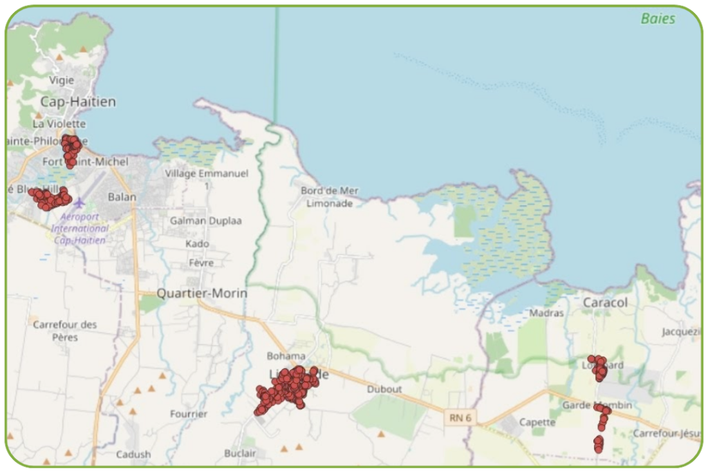 Figure 1: Areas of Cap Haïtien, Haiti, targeted in our survey of 603 households in Foujwol, Blouyiz,