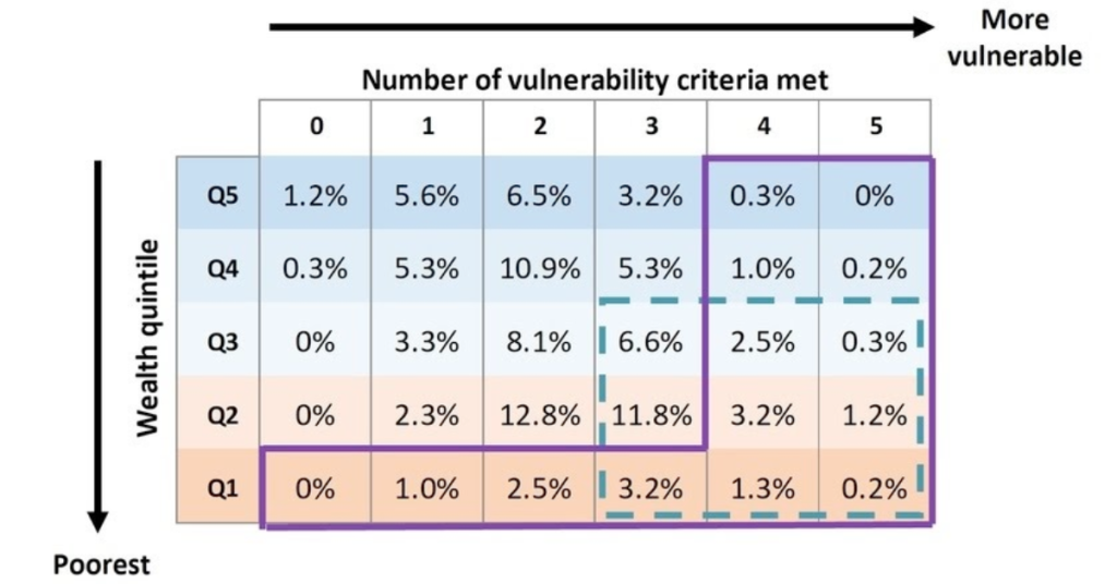 Figure 3: A subsidy targeting matrix showing options in purple (lowest wealth quintile or 4+ vulnerability criteria) and blue dashes (lowest 3 wealth quintiles and 3+ vulnerability criteria).