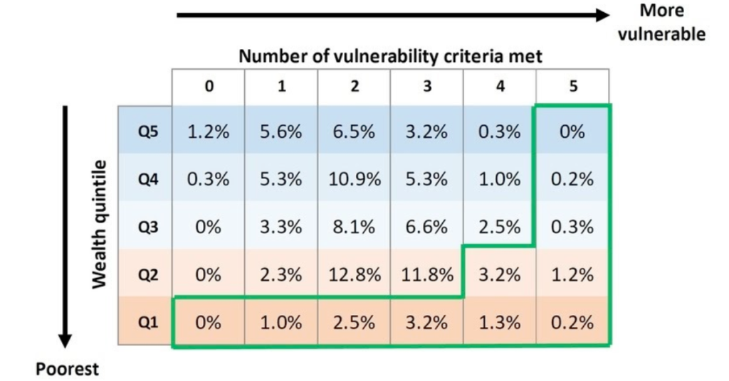 Figure 4: A subsidy targeting matrix showing wealth quintiles compared against the number of vulnerability criteria met and a stepped targeting option in green.