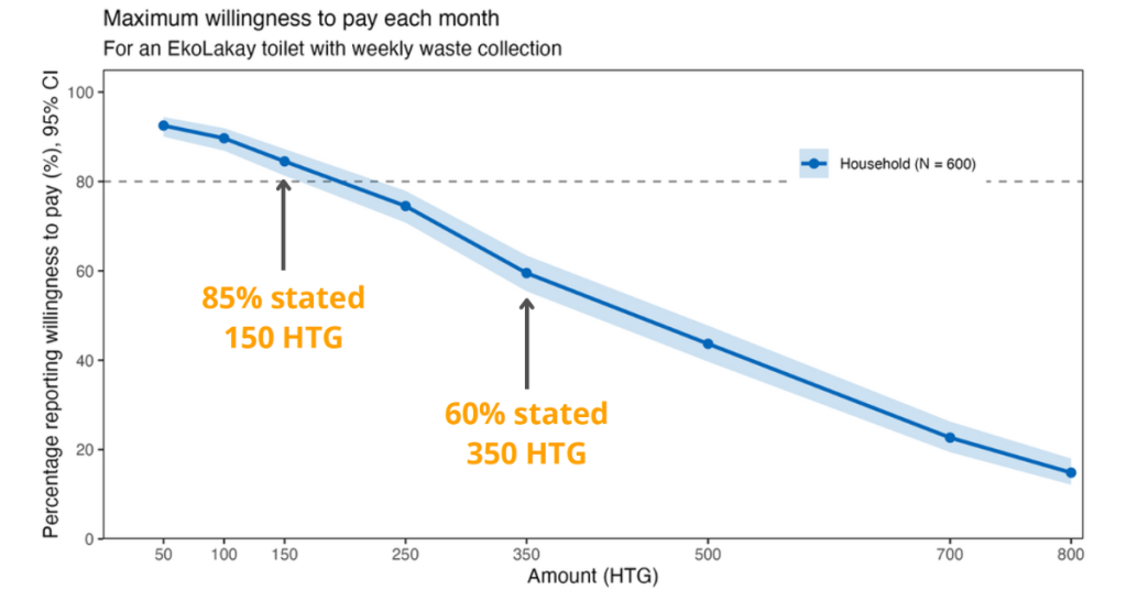 Past studies in low-resource settings have found that actual willingness to pay is often lower than stated willingness to pay. We therefore recommend subsidizing to 150-200 HTG to reach the most vulnerable households and promote 75-85% market penetration of EkoLakay toilets.